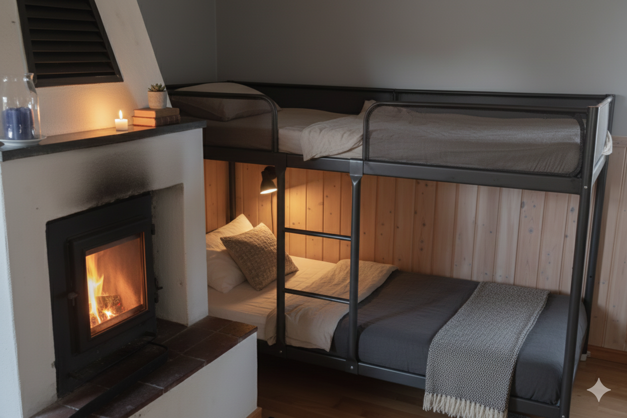 Wir haben ein Etagenbett und eine ausziehbare Couch.